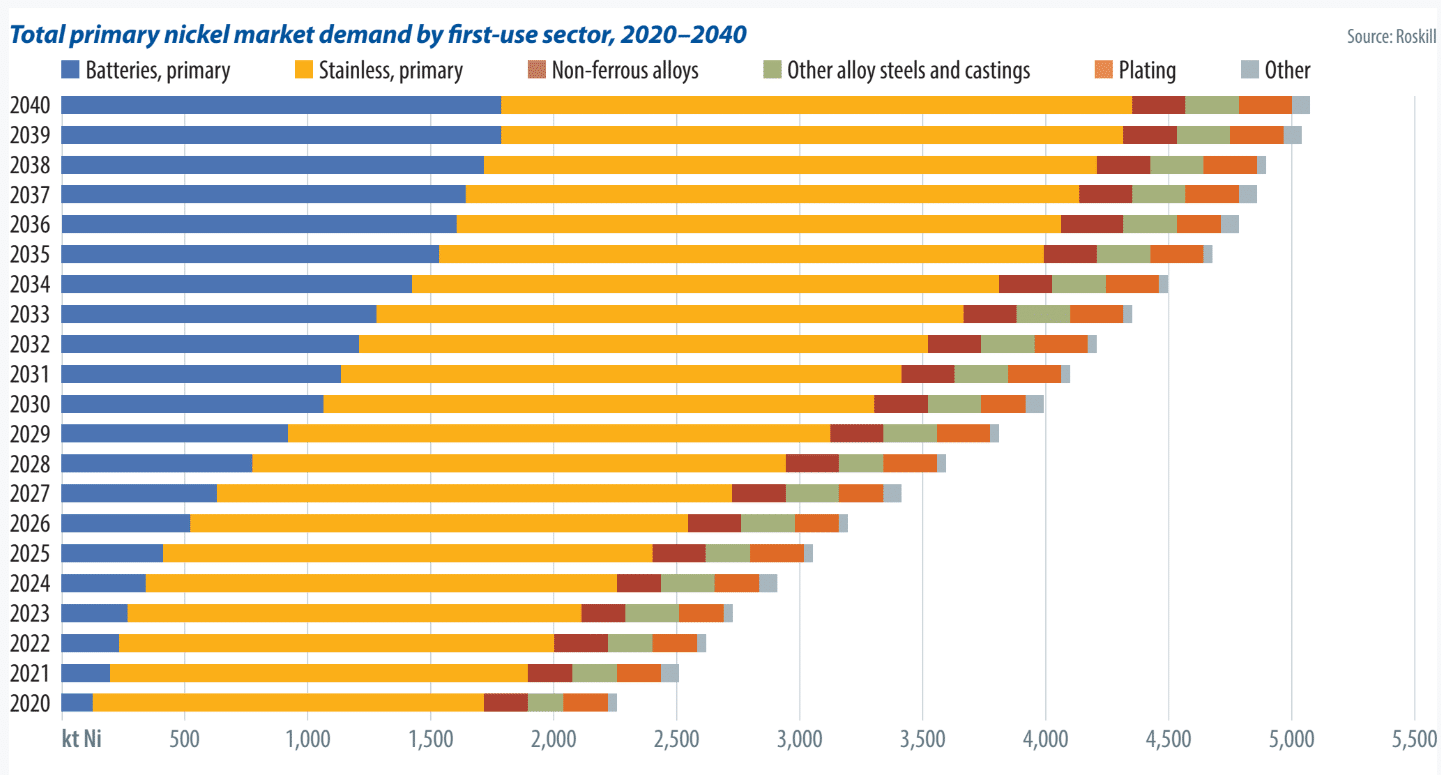 Batteries are by no means the only industry with an appetite for nickel. In 2020, around 70% of total nickel consumption came from stainless-steel production. Batteries, meanwhile, prompted demand of just 6% of the global nickel supply, with Roskill projecting that figure to increase to 36% by 2030, despite the growing popularity of LFP. In 2019, global refined nickel production reached 2.38 megatons, with that figure set to grow by 4.7% per year through to 2030. Recently added feedstock did not meet the requirements for the industry, Roskill reports.