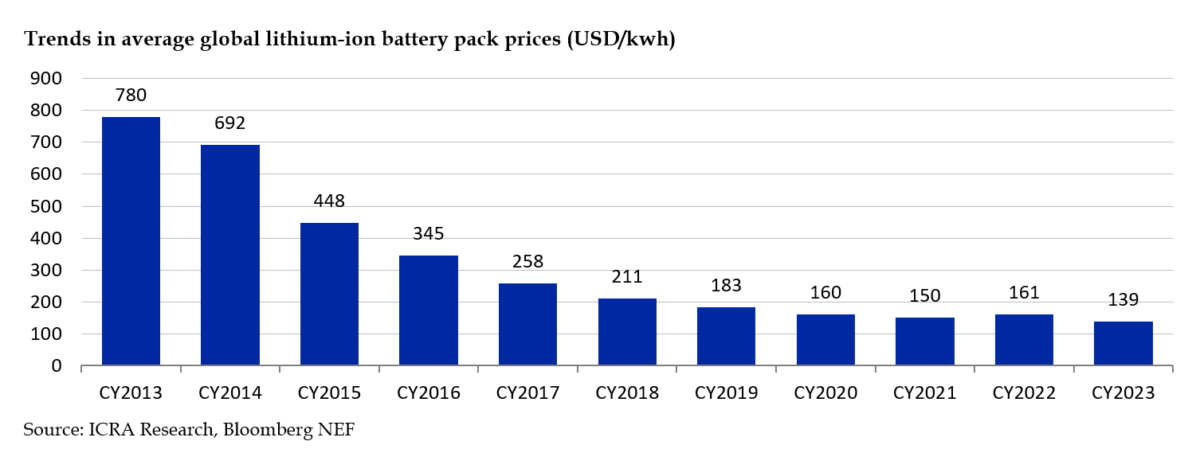 The decline in battery costs over the past decade leading up to 2021 helped reduce the cost of energy storage and adoption of BESS projects globally. While the prices went up in 2022, they declined in 2023 to an all-time low, led by the moderation in raw material prices, amid the increase in production across the value chain. Cheaper battery prices are the key to increased adoption of BESS projects, in ICRA’s view.
