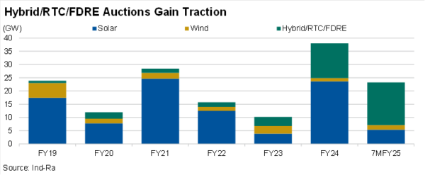 During April-October 2024, significant capacity of exceeding 25 GW were auctioned in the renewables space (compared to 38 GW in FY 2024 and 10 GW in FY 2023) with a larger share under firm and dispatchable renewable energy (FDRE)/peak/hybrid tenders. This reflects demand for adding ‘renewable energy capacity with storage’ to offset the risks stemming from the uncertainty and intermittency of renewable energy.