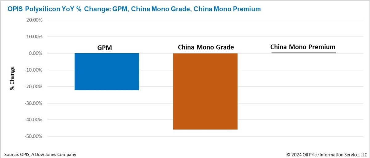 The China Mono Grade, OPIS’ assessment for mono-grade polysilicon prices within the country, remained stable this week at 33 yuan/kg, equivalent to CNY 0.074 ($0.010)/W. Meanwhile, the China Mono Premium, OPIS’ price assessment for mono-grade polysilicon designated for n-type ingot production, experienced a slight uptick of 0.96%, reaching CNY 39.375/kg, or CNY 0.089/W, compared to the last assessed price on December 17.