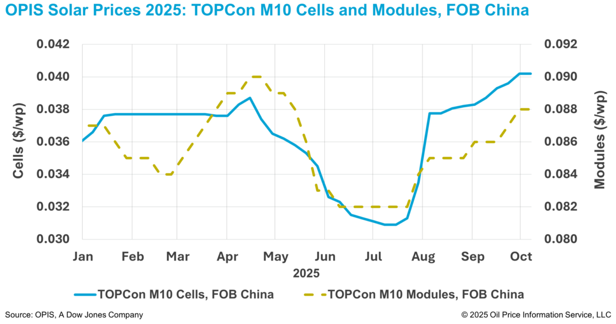 According to the OPIS Solar Weekly Report released on October 7, FOB China TOPCon M10 cell prices held steady this week at $0.0402/W, with price indications between $0.0380-0.0426/W, pausing a four-week rally as trading slowed during China’s Golden Week holiday.