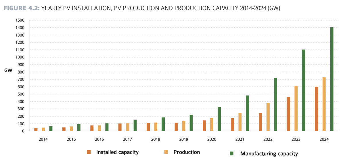 The report also notes that total global solar module manufacturing capacity reached 1,405 GW annually, of which 83% was located in China.