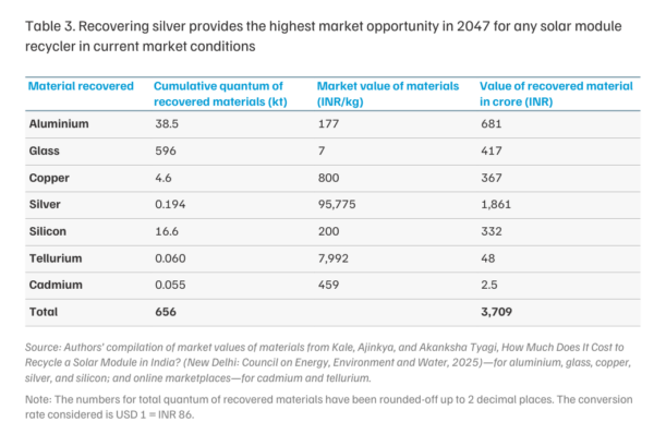 Recovering and selling materials from discarded solar panels could be around INR 3,700 crore worth market opportunity in 2047, according to new studies by the Council on Energy, Environment and Water (CEEW). The highest share comes from silver—INR 1,861 crore or 50% of the total.