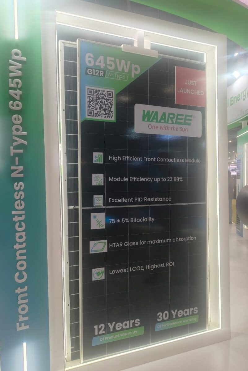 At REI 2025, Waaree Energies showcased its 645 Wp TOPCon G12R back-contact solar module with a high efficiency of 23.88%. The module is part of TEJOMAY series that features dual-glass back-contact modules from 635 Wp to 665 Wp with efficiencies from 23.51% to 24.62%, respectively.