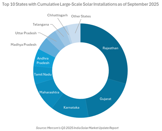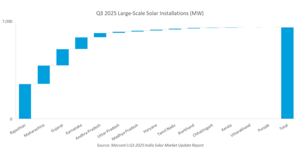 Rajasthan, Maharashtra, and Gujarat led large-scale solar capacity additions in the quarter. Rajasthan contributed 38.2% to installations in Q3, while Maharashtra and Gujarat comprised 20.2% and 17.7% respectively, of the capacity commissioned during the quarter.