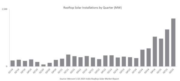 In the third quarter (Q3) of 2025, 2.1 GW of rooftop solar capacity was installed, marking the highest quarterly additions to date. This represents more than 165% YoY growth from 791.1 MW in Q3 2024.