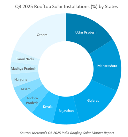 Uttar Pradesh led the country’s rooftop solar capacity additions, accounting for 16% of the quarterly installations. Maharashtra and Gujarat ranked second and third, respectively, accounting for more than 15% and 14% of capacity installed during the quarter.
