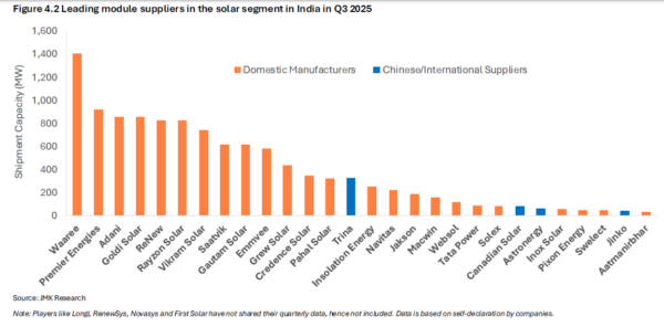 Waaree Energies Ltd has emerged as the leading solar module supplier in India by shipment volume in the third quarter of 2025, according to the latest RE Market Update from JMK Research & Analytics. The report notes that about 11 GW of modules were shipped to the Indian market in Q3 2025 by 28 major players—both domestic and international—with Indian manufacturers accounting for more than 95% of the total.