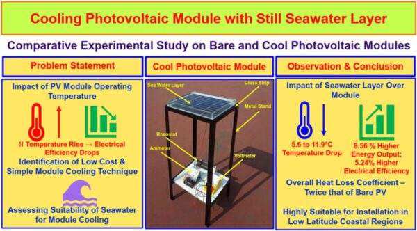 A research team led by the Indian Institute of Petroleum and Energy (IIPE) has developed a novel solar panel passive evaporative cooling system that utilizes a still seawater layer over a horizontally oriented module.