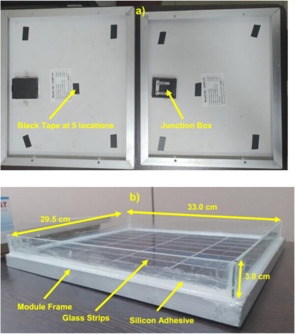 For their study, the group has used a 10 W polycrystalline module, with an area of 0.105 m2. Four clear window glass strips, each 0.003 m-thick and 0.03 m-high, were placed along the module’s inner perimeter using silicone adhesive, creating space for seawater. The salinity of the seawater was 30.00 PPT with a pH level of 8.04. The thickness of the seawater layer was either 30 mm, 5 mm, or 4 mm.