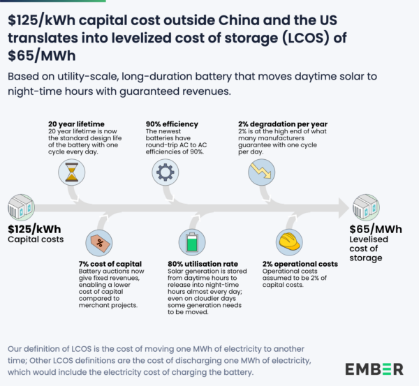 A new analysis from energy think tank Ember shows that the cost of storing electricity with utility-scale batteries has fallen to just $65/MWh as of October 2025 outside China and the US, making it economically feasible to deliver solar power when it is needed.