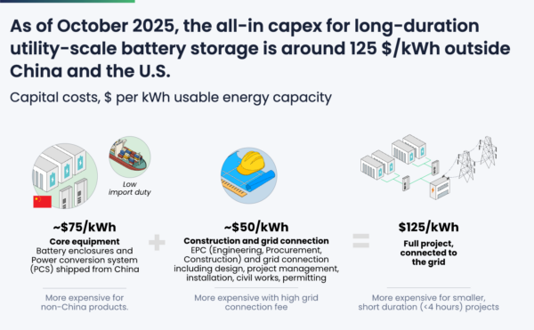 The research assesses the cost of a full battery storage system connected to the grid as only $125/kWh as of October 2025. This is for long-duration (four hours or more) utility-scale battery projects in global markets outside China and the US. Core battery equipment delivered from China now costs around $75/kWh, while installation and grid connection typically add about $50/kWh.