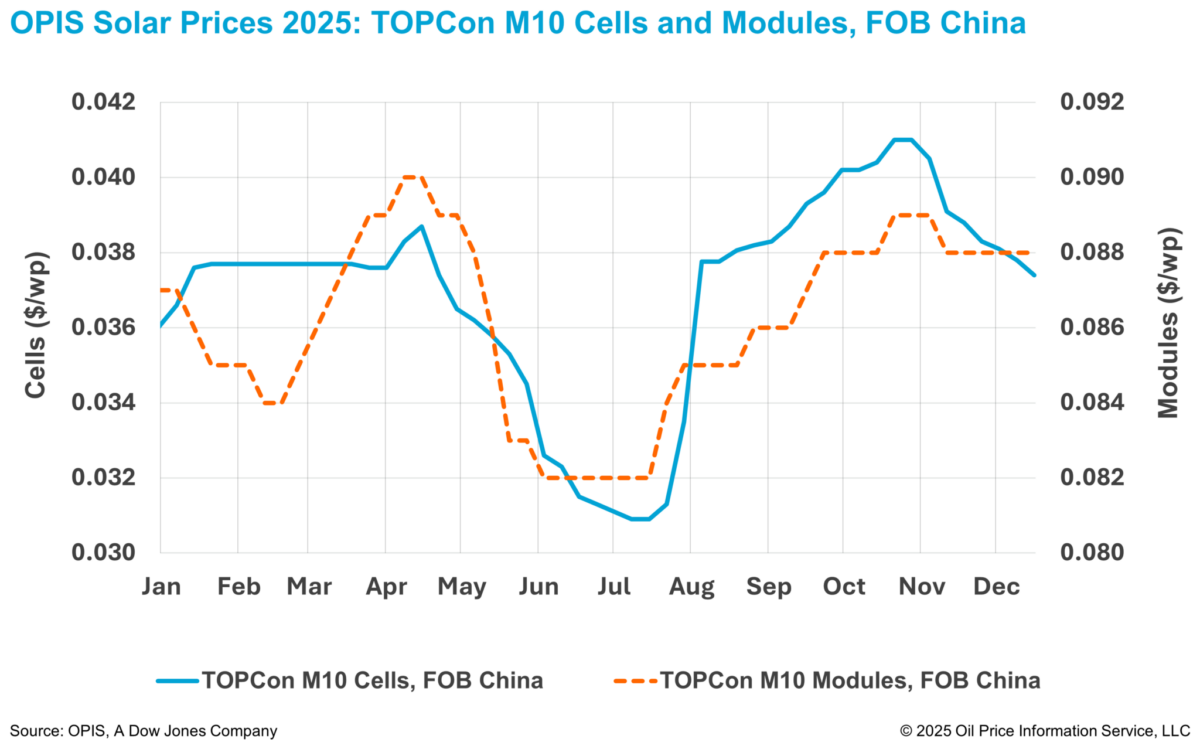 According to the OPIS Solar Weekly Report released on December 16, FOB China TOPCon M10 cell prices were assessed 1.06% lower at $0.0374/W, with price indications between $0.0364-0.0387/W.