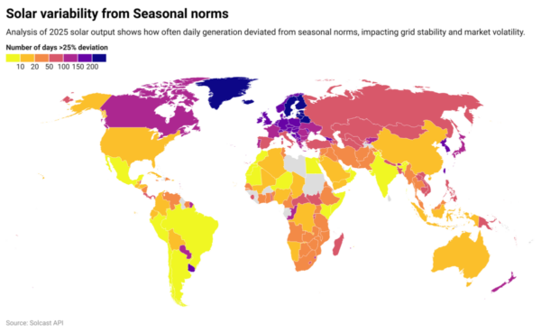 Beyond peak output, the dataset also illustrates the extent of solar generation variability. Using a metric that identifies days with national generation deviating more than 25% from seasonal averages, Solcast highlighted the degree of inter-day variability faced by grid operators. The most stable solar outputs can be observed to be associated with climatically stable regions, most typically arid areas, and in in countries with geographically dispersed solar fleets, such as India, Australia, the United States, and Brazil, where regional weather differences tend to average out. Still, the occurrence of high-variability days across all regions underscores the importance of accurate short-term forecasting in balancing grids dominated by variable renewables.