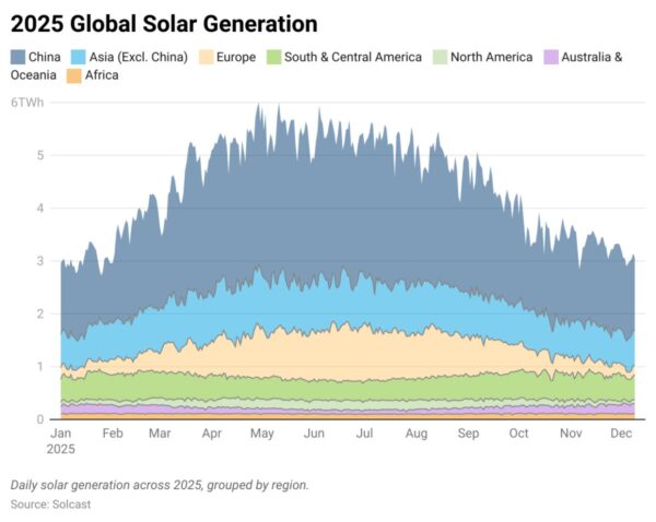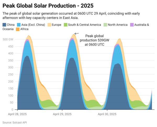 A new analysis from Solcast data scientists using Microsoft’s Global Renewables Watch dataset offers a detailed look at solar generation across the planet in 2025. Drawing from a model based on Microsoft’s satellite-derived database of 86,410 commercial PV assets worldwide, the Solcast API was used to simulate hourly production data for the entire calendar year. The study reveals the global peak of solar output occurred on April 29 at 06:00 UTC, reaching an estimated 540 GW, and highlighting seasonal variability and geographic patterns in solar output. These findings are based on a large scale data analysis completed using Solcast irradiance data and the Solcast API.