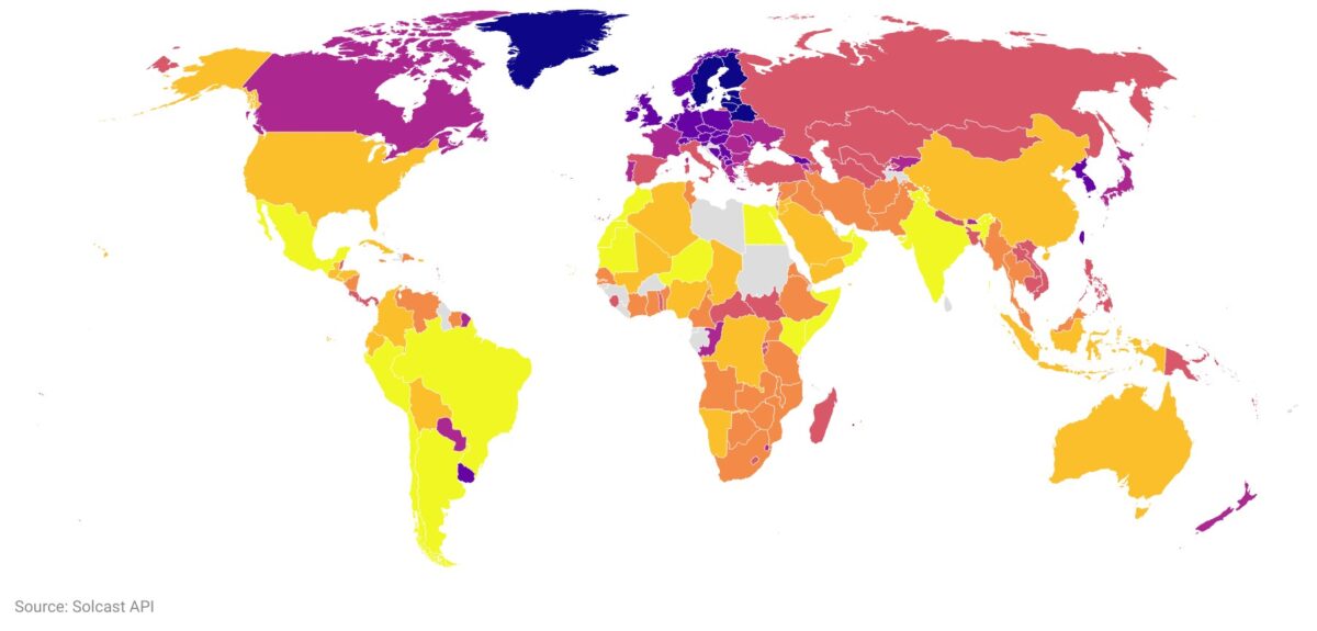 Beyond peak output, the dataset also illustrates the extent of solar generation variability. Using a metric that identifies days with national generation deviating more than 25% from seasonal averages, Solcast highlighted the degree of inter-day variability faced by grid operators. The most stable solar outputs can be observed to be associated with climatically stable regions, most typically arid areas, and in in countries with geographically dispersed solar fleets, such as India, Australia, the United States, and Brazil, where regional weather differences tend to average out. Still, the occurrence of high-variability days across all regions underscores the importance of accurate short-term forecasting in balancing grids dominated by variable renewables.
