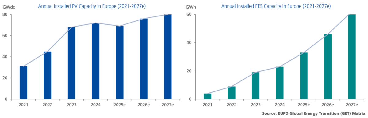 In parallel, energy storage has moved to the center of Europe’s market momentum. While solar PV growth slowed across several major European markets in 2025, battery storage installations expanded sharply, with capacity estimated to exceed 29 GWh, representing an increase of more than 36% compared to 2024 levels, according to the EUPD Electrical Energy Storage Report© H2 2025. Rising occurrences of negative electricity price hours, growing grid stabilization requirements, and a stronger focus on maximizing on-site consumption are reinforcing storage as a core system component rather than an add-on.