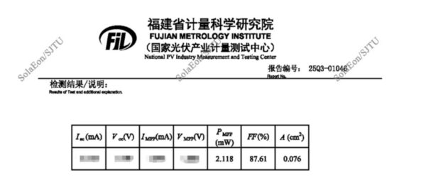 The reported efficiency was achieved on a unit cell with an active area of 0.076 cm², placing the device in the laboratory research category. The cell was also found to achieve a fill factor of 87.61%.