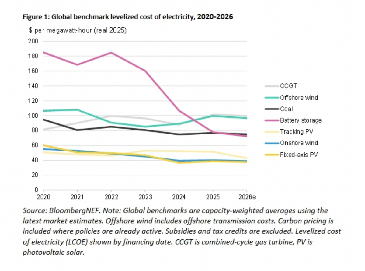 The analyst’s Levelized Cost of Electricity 2026 report says that while benchmark costs for solar all rose in 2025, due to a combination of supply chain constraints, poorer resource availability and market reforms in China, innovation and competition will lead to declining costs over the next decade.