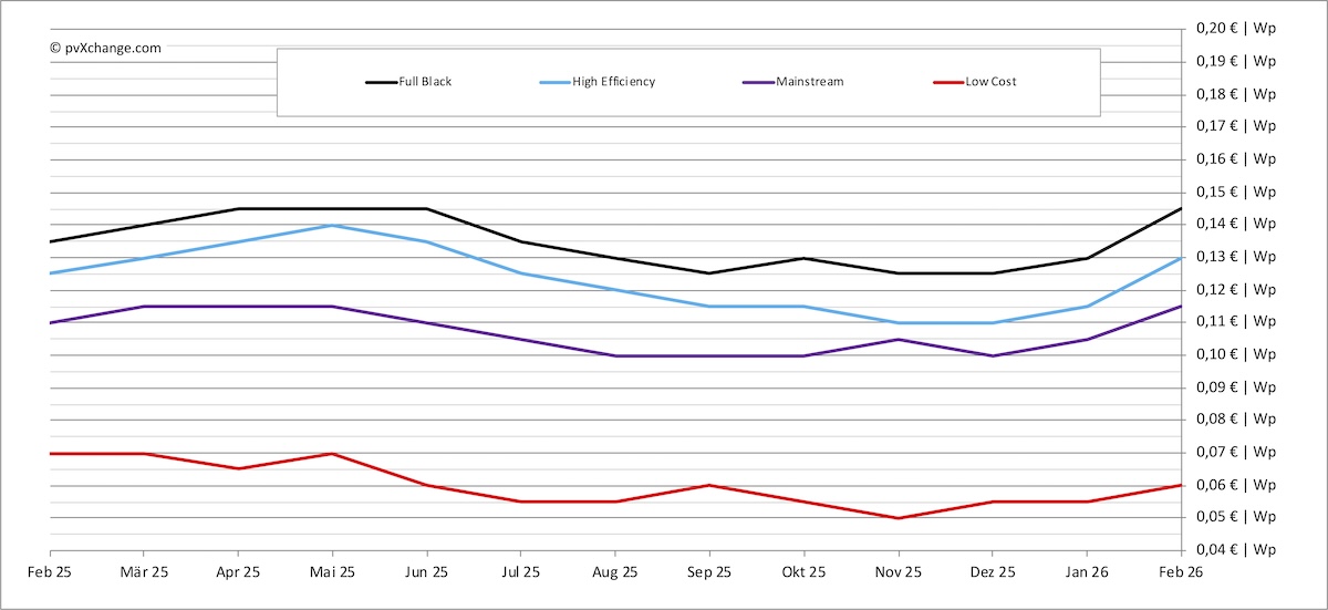 Module prices increased more sharply than anticipated in February across all major technology classes. Most products rose by around €0.01/W to €0.015/W. Modules for small rooftop systems recorded larger increases than utility-scale products. Prices have moved above January 2025 levels and now stand 15% to 18% above the December 2024 low.