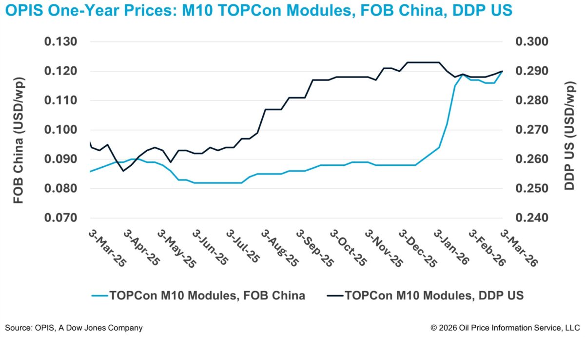 However, trading activity for April remains subdued. Manufacturers noted that buyers are largely staying on the sidelines, anticipating softer prices in the weeks ahead. Many are reluctant to confirm purchases, expecting prices could weaken in April after the cancellation of the export tax rebate. One international module buyer told OPIS they prefer to delay negotiations and reassess pricing conditions after Q1 2026, citing recent market volatility.