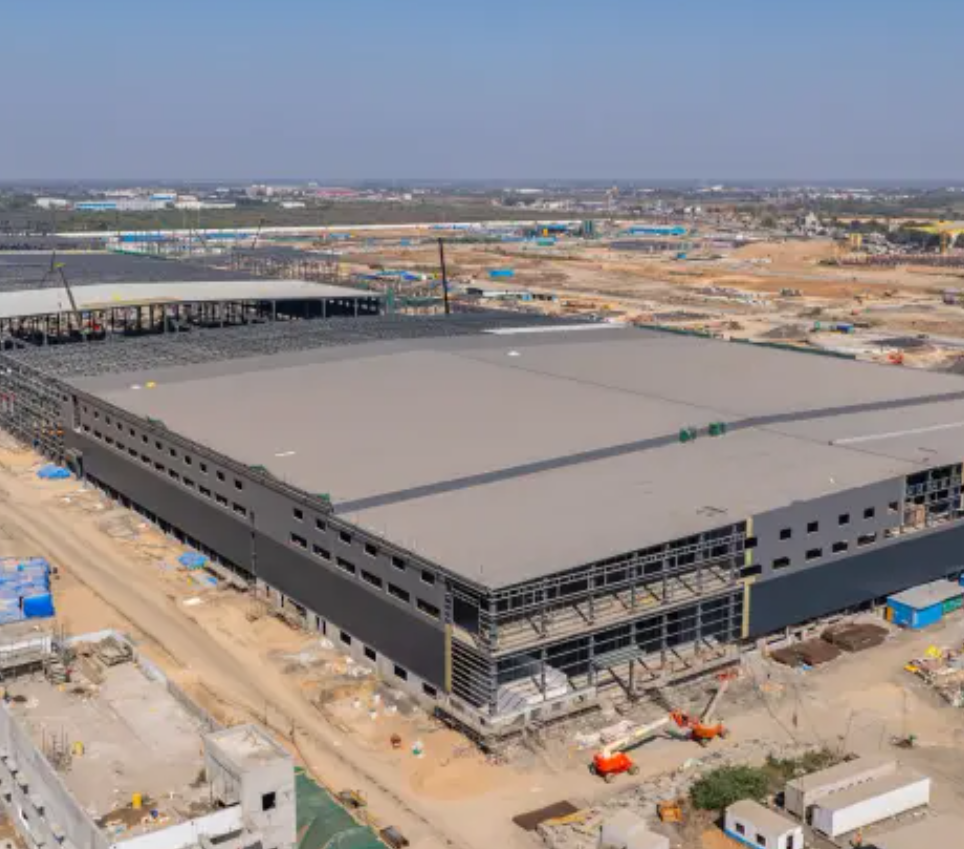 The steel frame, now complete, spans 700 metres in length, 150 metres in width, and rises to 34 metres at its highest point, covering a built-up area of 105,000 square metres. Over 24,000 tonnes of steel have been deployed in the main structure, with work on associated buildings progressing in parallel. At peak construction, over 2,500 skilled workers were engaged on-site simultaneously.