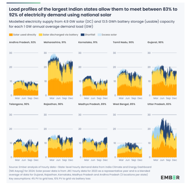 Seven states reach 90% or more, led by Andhra Pradesh (92%). Uttar Pradesh shows the weakest result but remains at a high level of 83%. “States with higher demand in the sunniest months achieve the highest shares, while states with stronger monsoon-season demand, like Uttar Pradesh and West Bengal, perform less well,” states the report.