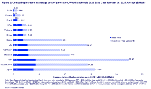 Wood Mackenzie’s latest analysis adds that the average costs of generating is likely to increase by $2.30/MWh across the 13 analyzed markets using its Base Case scenario, which assumes that geopolitical de-escalation will enable fuel price moderation in the latter half of 2026.