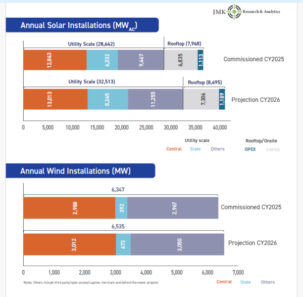 India installed around 28.6 GW of utility-scale solar and 7.9 GW of rooftop solar capacity in calendar year 2025. Of the rooftop additions, 6,835 MW was deployed under the capex model and 1,113 MW under the opex model. The country also added 6.3 GW of new wind capacity during the year—according to Annual India Solar & Wind Report Card – CY2025 by JMK Research.