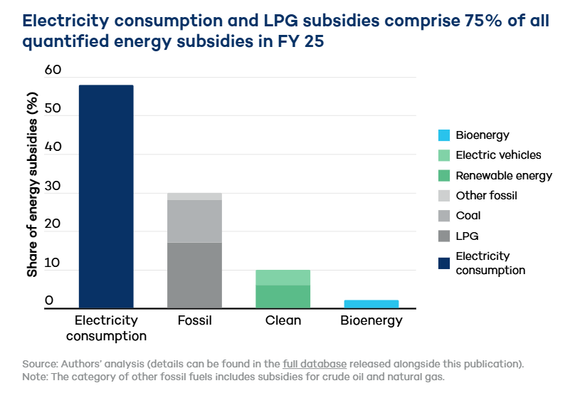 The report stated that India spent at least INR 4.3 lakh crore ($51 billion) on energy subsidies last fiscal year, 75% of which were consumption subsidies for electricity and LPG, highlighting the scale of public spending currently required to manage energy affordability. While subsidies like this have played a critical role in expanding energy access and protecting households from high, volatile fuel prices, they risk becoming an unsustainable burden for governments.