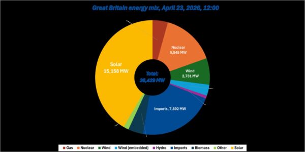 Historic generation data available through NESO’s GB Generation mix dashboard show 15,147 MW of solar generation at 11:30 am on April 23. It was the first time 15 GW was breached in the data series which records generation at half-hourly intervals dating back to 2009. Solar output then peaked at midday with 15,158 MW recorded, representing 42% of the 36.4 GW total generation mix.